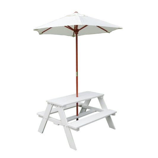 Изчерпана НаличностОчаквана дата на доставка: 05.03.2026Градински Комплект GINGER HOME, Детска Маса за Пикник, Чадър anti-UV 30+, Дървен, Игри на Открито, Бял, 89х79х50 см.