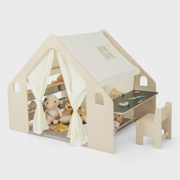 Детска Дървена Къща за Игра 6 в 1 GINGER HOME – Стол, Маса, Черна Дъска, Органайзер, Тента и Мека Подложка
