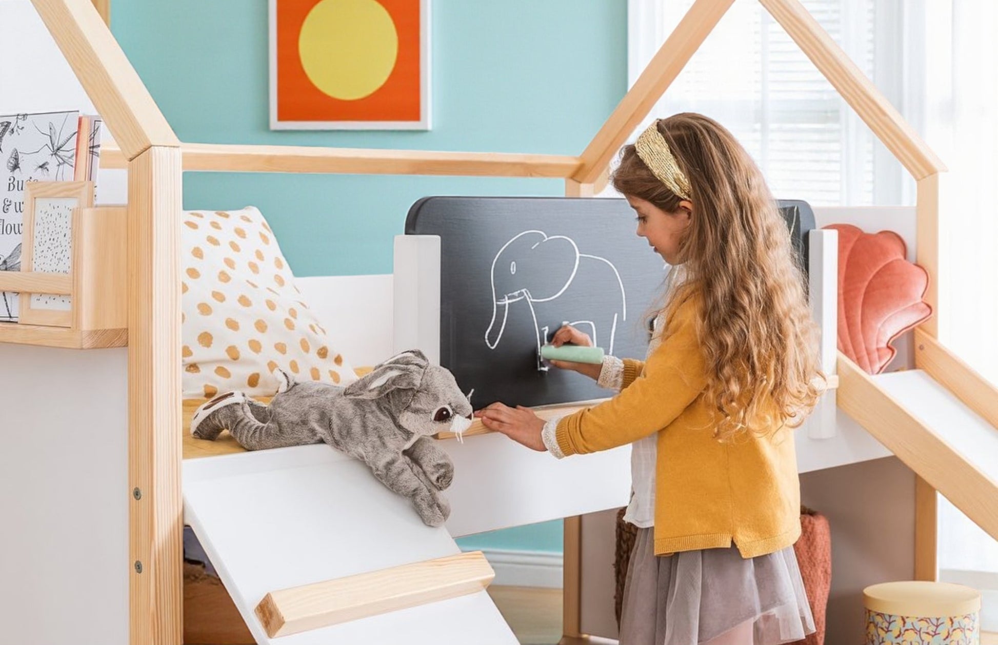 • Черна дъска: Насърчава творчеството и ученето чрез игра. Позволете на артистичната страна на детото ви да засияе с включената черна дъска за рисуване. Същевременно черната дъска е и преграда против падане, за пълна безопасност на вашето дете по време на сън в Детското легло Къщичка.