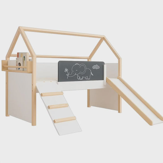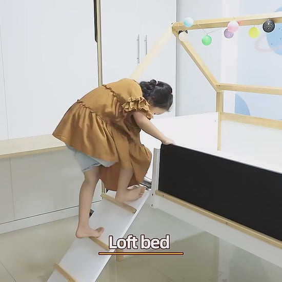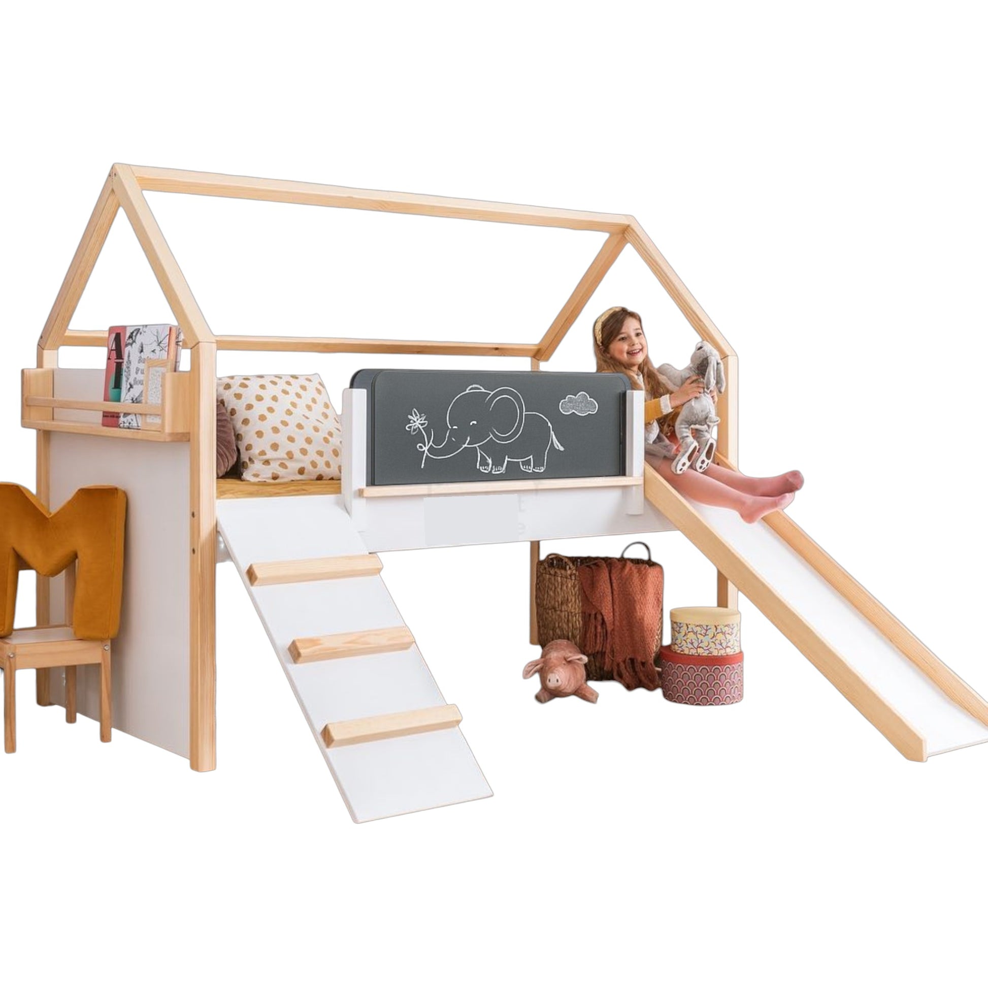 Детско Легло Къщичка GINGER HOME, Монтесори, Двуетажно, Пързалка, Черна Дъска, Подматрачна Рамка 90х200 см
